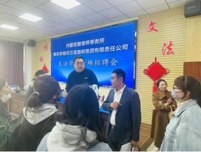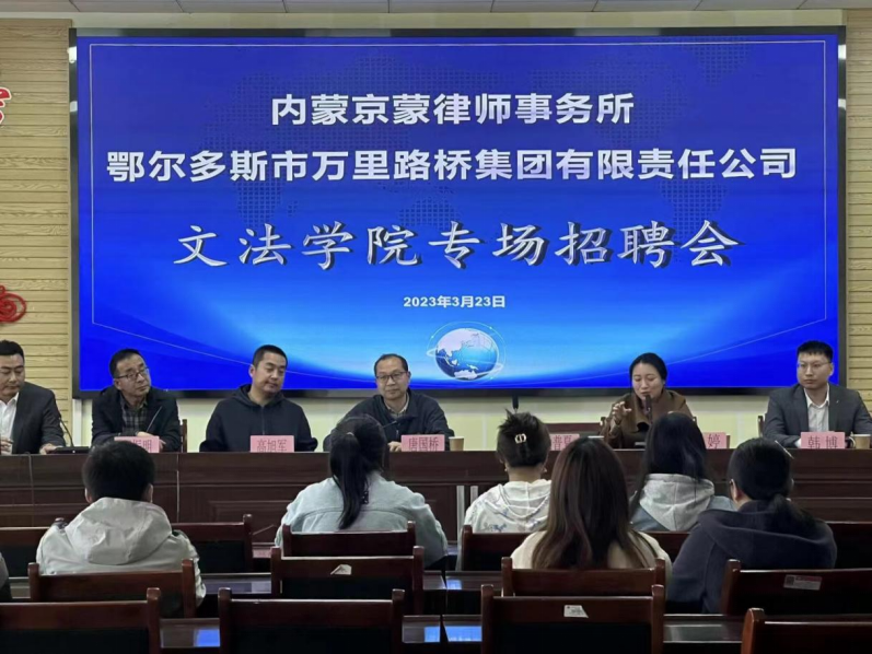 2023年3月23日下午,内蒙京蒙律师事务所和鄂尔多斯市万里路桥集团有限责任公司应邀在明德楼东A411举办法学、汉语言文学、和秘书专业的专场招聘会。内蒙京蒙律师事务所主任段普复、执业律师韩博,鄂尔多斯市万里路桥集团有限责任公司常务副总乔婷、经营副总高旭军一行到访yl23455永利集团。yl23455永利集团党委副书记兼副院长唐国桥、法学系副教授郝振明、毕业班班主任以及全体在校毕业生参加了此次招聘会。