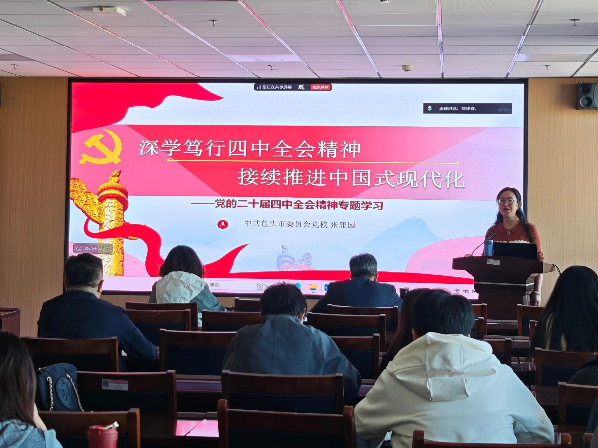 为深入领会、精准把握党的二十届四中全会精神实质与丰富内涵,切实把思想和行动统一到党中央决策部署上来,2025年11月13日,yl23455永利集团党委组织召开了学习贯彻党的二十届四中全会精神专题培训学习活动。会议特邀中共包头市委员会党校张鹿园老师作专题授课,学院党委副书记(主持工作)薛建春主持会议,学院全体教职工及学生党员参加学习。
