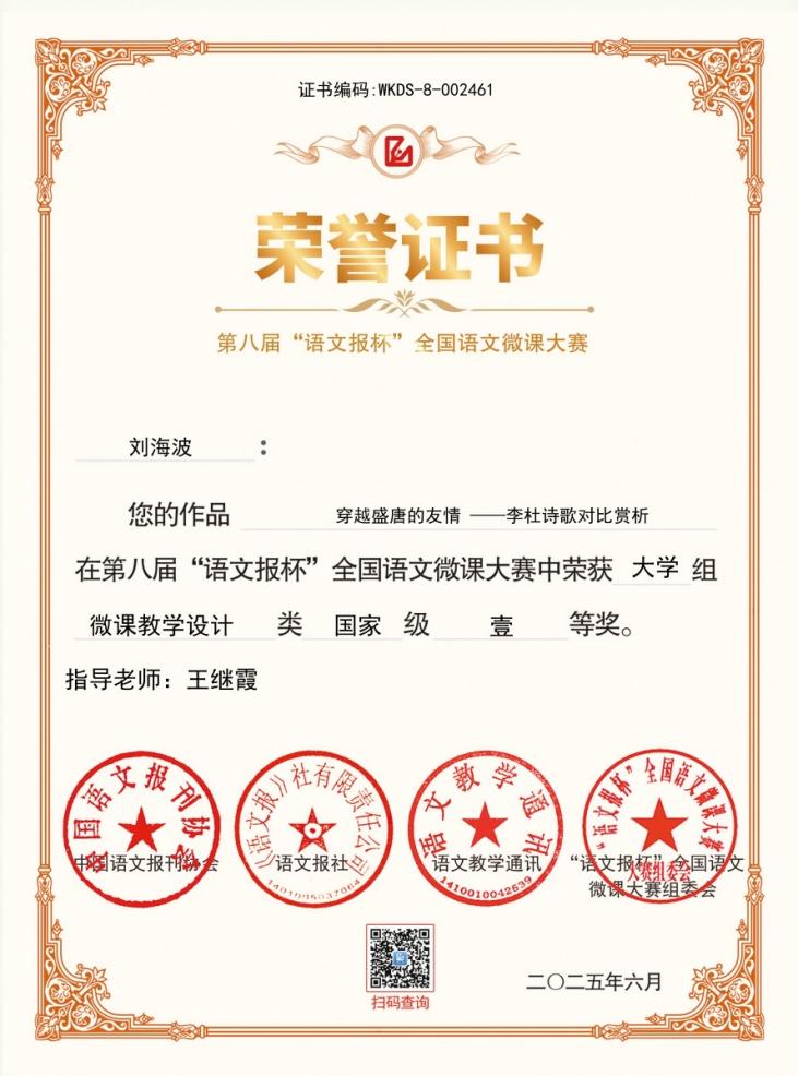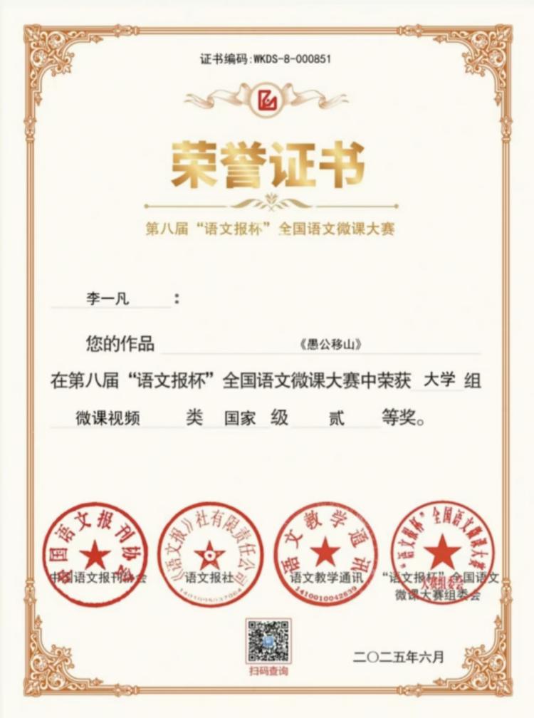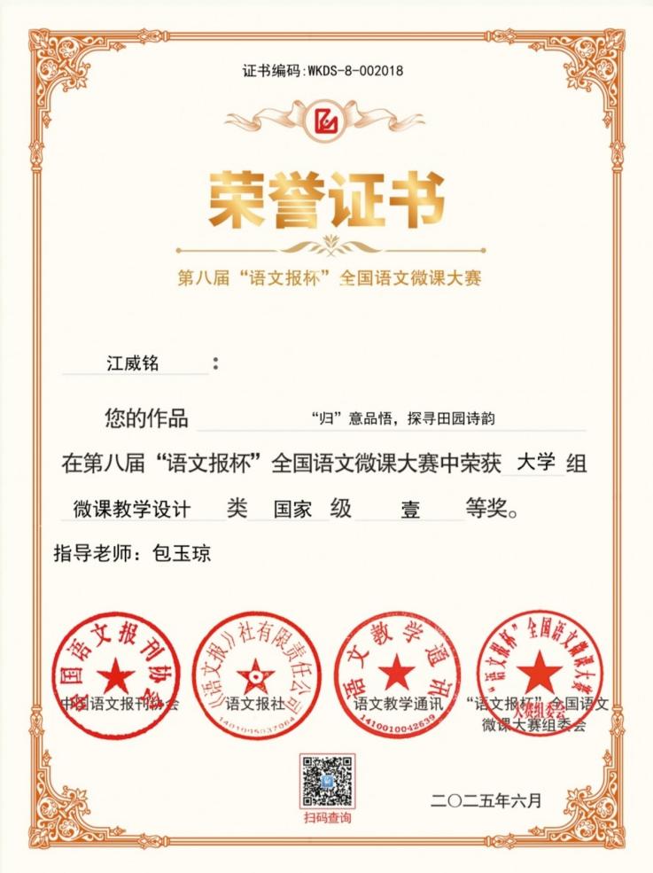2025年5月30日,第八届“语文报杯”全国语文微课大赛评审结果正式揭晓,经过组委会专家严格评审,我院学科教学(语文)硕士教育中心学子凭借扎实的专业素养和出色的教学实践能力脱颖而出,斩获多项国家级奖项:江威铭、刘海波荣获微课教学设计类国家级一等奖,刘宇彤获微课教学设计类国家级二等奖,李一凡获微课视频类国家级二等奖。