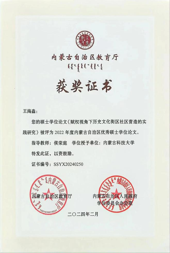 近日,内蒙古自治区教育厅公布了2022年度内蒙古自治区优秀博士和硕士学位论文评选结果,由我院侯荣庭副教授指导,社会工作硕士毕业生王海淼同学撰写的学位论文《赋权视角下历史文化街区社区营造的实践研究》荣获内蒙古自治区2022年度优秀硕士学位论文,本次获奖是我院社会工作硕士教育中心连续两年荣获自治区级优秀硕士学位论文,这不仅是对获奖师生的肯定,更是我院长期以来注重研究生培养质量、鼓励学术创新的体现。