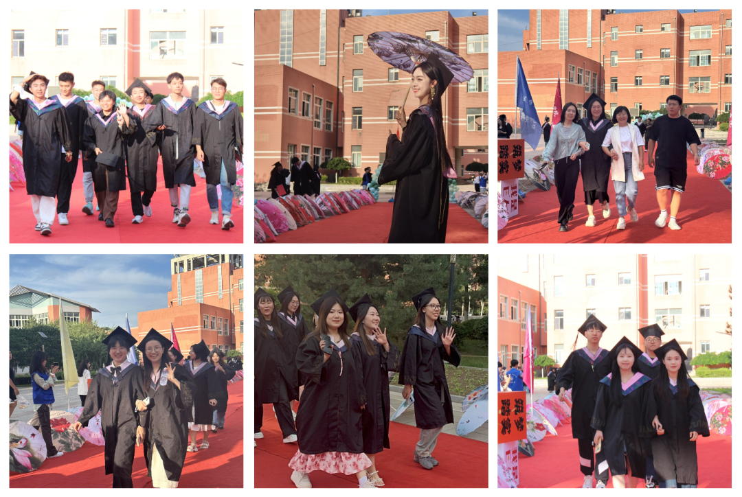 典礼开始前的红毯仪式定格了学子们闪亮的时刻。毕业生们踏上了那铺设着红地毯的神圣通道,坚定而又自信。他们怀揣着梦想与憧憬,仿佛在向世界宣告自己即将开启人生新篇章,在签名墙、打卡地拍照留念,洋溢着喜悦与不舍,谈笑间传递着对校园生活的深深眷恋。