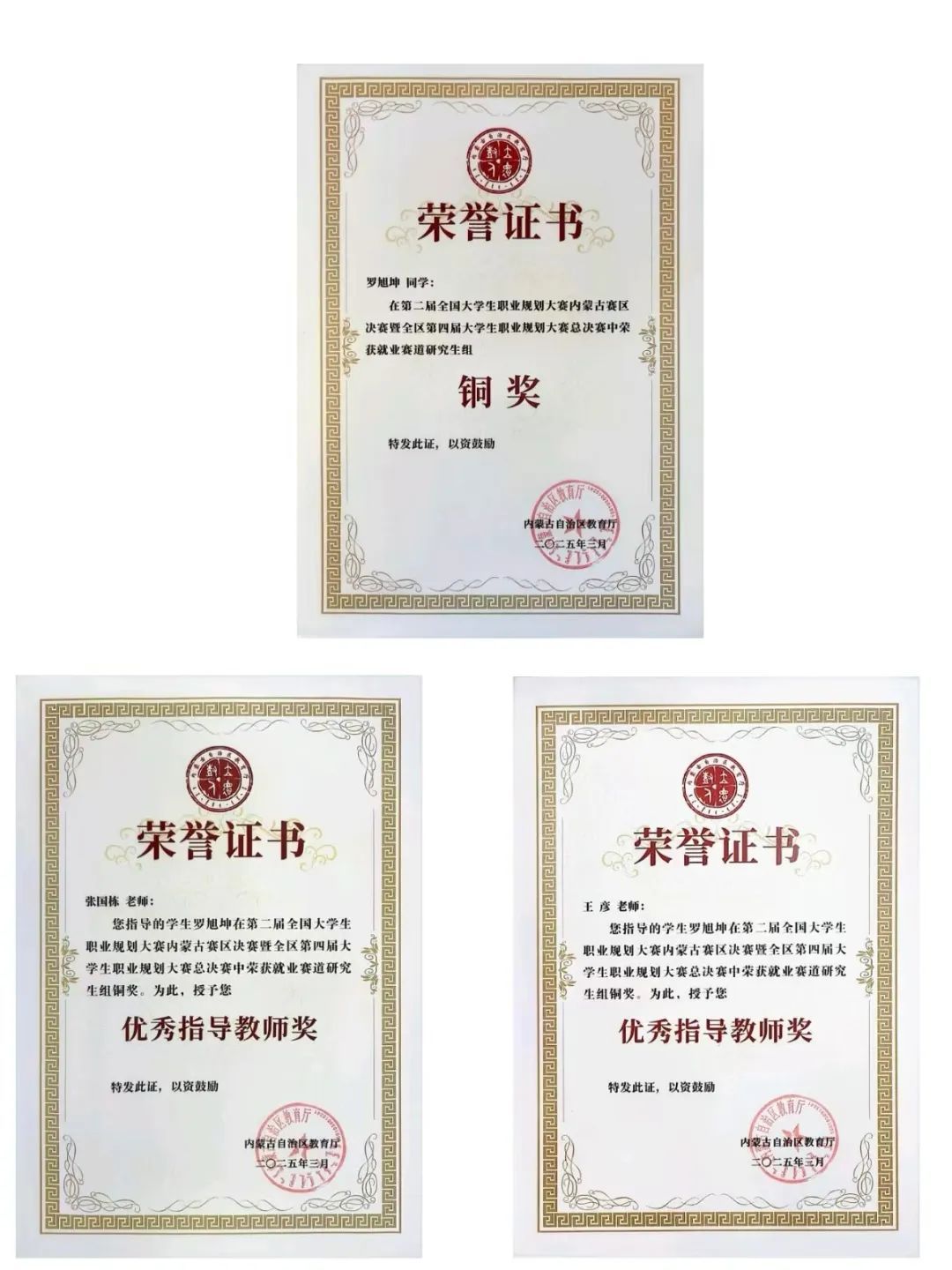 2025年2月28日至3月2日,第二届全国大学生职业规划大赛内蒙古赛区决赛暨全区第四届大学生职业规划大赛总决赛在内蒙古师范大学成功举办。我院2024级法律硕士研究生罗旭坤同学获就业赛道研究生组铜奖,张国栋、王彦两位教师获优秀指导教师奖。