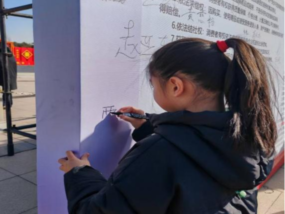 活动现场设置“理性消费·依法维权”主题签名墙,到场市民与学生纷纷写下名字与维权寄语,领取《消费维权普法手册》,在轻松氛围中开启维权知识学习。