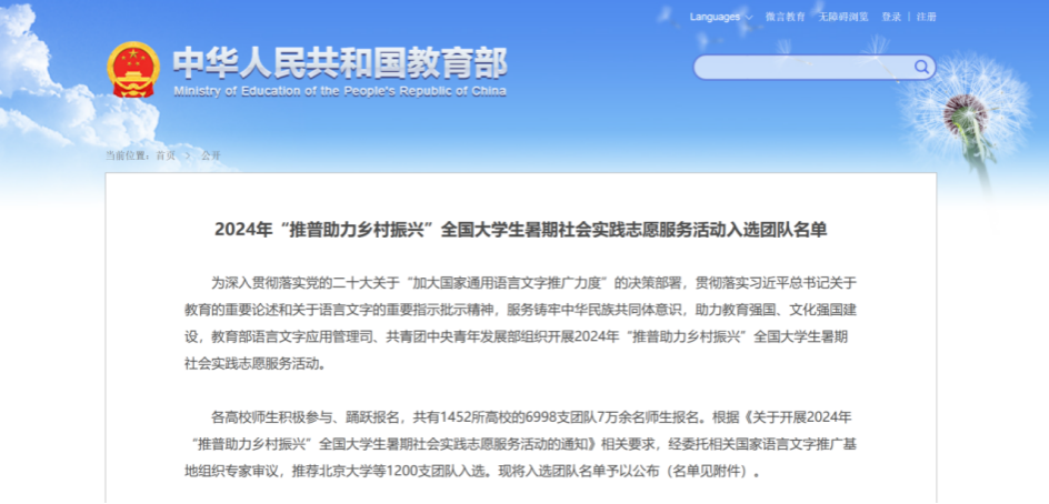 我院“萤火”志愿服务队成功入选教育部语言文字应用管理司、共青团中央青年发展部组织开展的2024年“推普助力乡村振兴”全国大学生暑期社会实践志愿服务活动。