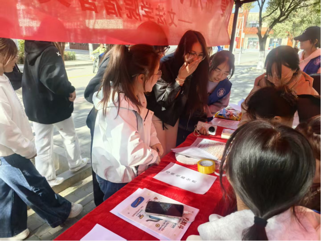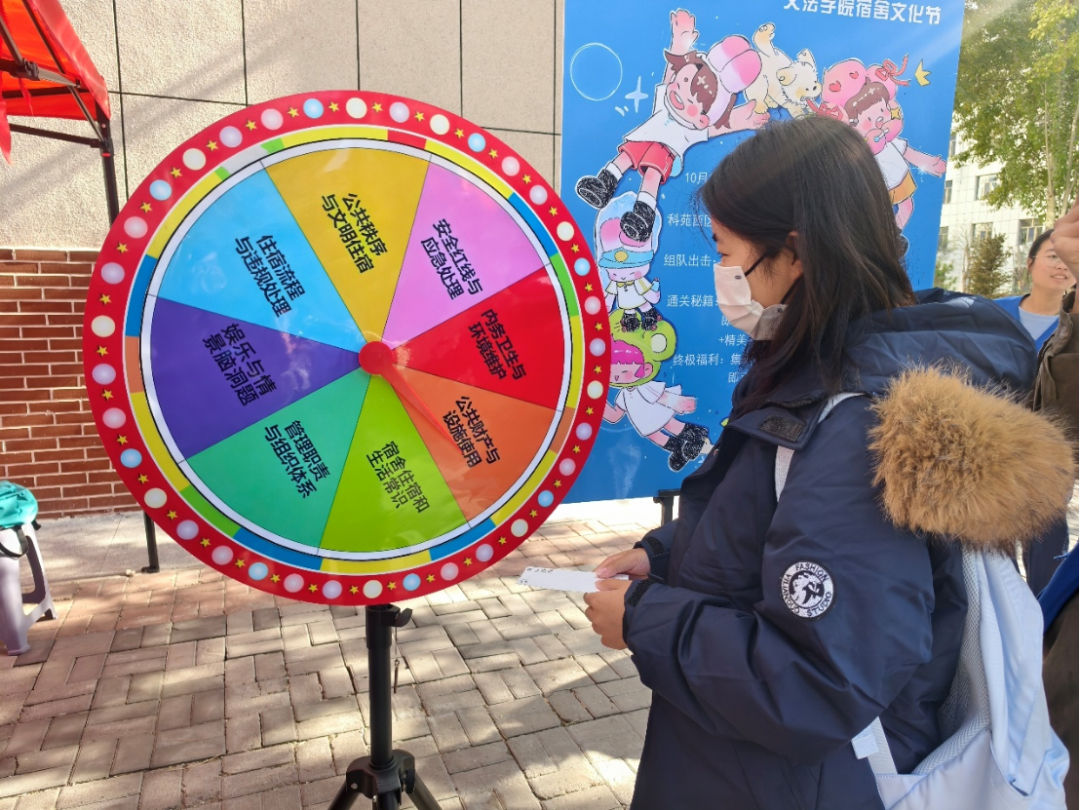 活动现场热闹非凡,同学们热情高涨,踊跃参与。在5号楼前的 “平安宿舍‘答’人赛” 区域,彩色转盘飞速旋转,各类安全知识题目引发同学们的热烈互动。同学们时而因思索题目而眉头微蹙,时而因成功解答而喜笑颜开。印章落下的“啪嗒”声同于传统的课堂讲授,本次活动创新采用趣味竞技的形式,激发同学们主动学习宿舍安全知识的热情,成功将“要我学”转化为“我要学”。这种寓教于乐的,犹如清脆的胜利鼓点。在轻松愉快的氛围中,将宿舍安全准则深植于每个人心中。不方式不仅让安全知识真正内化于心,更推动同学们将所学外化于行,进一步筑牢了校园安全的“宿舍防线”。