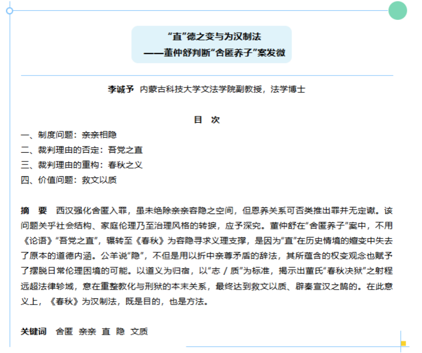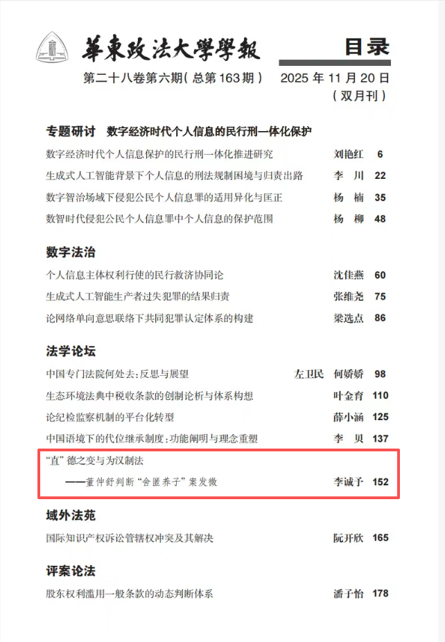 我院法学系教师李诚予副教授在《华东政法大学学报》2025年第6期上发表高质量学术论文《“直”德之变与为汉制法——董仲舒判断“舍匿养子”案发微》。《华东政法大学学报》先后入选CSSCI法学来源期刊、中文法律核心期刊和中国人文社会科学法学核心期刊,并获评“全国高校百强社科期刊”“全国高校社科精品期刊”“上海市最佳学报”。
