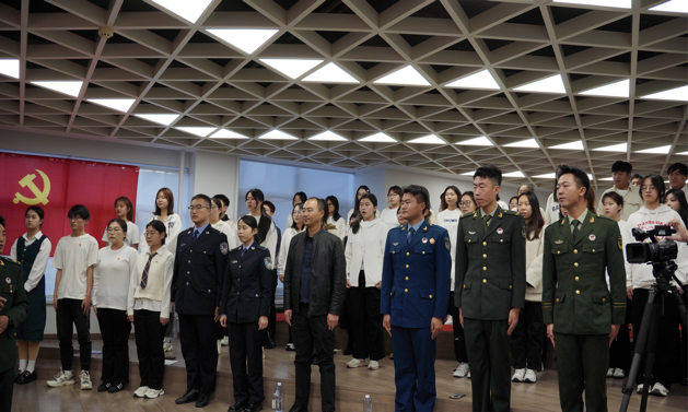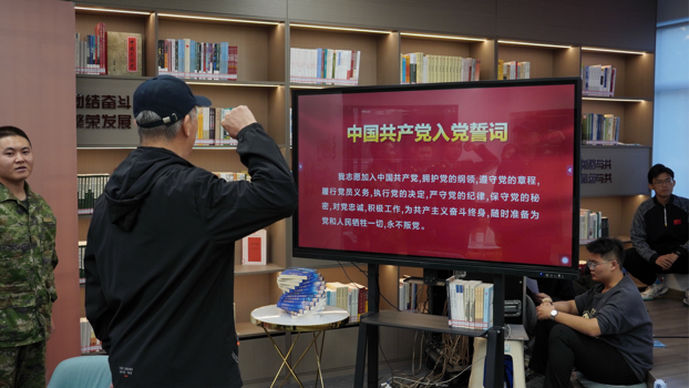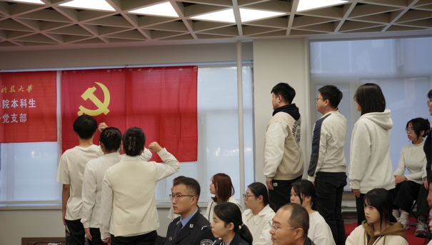 在庄严神圣、鲜艳夺目的党旗下,老兵同志带领现场全体党员面向党旗再次重温入党誓词,为本次活动带来力量与温度。接着,大家以饱满的精神、优美的歌声唱出《强国一代有我在》,抒发着对祖国的热爱,也用歌声诠释了自己为国奋斗的坚定决心。伴随着音乐缓缓进入尾声,大家齐声高喊:“请党放心,强国有我”,展现出支部成员积极向上、砥砺前行的精神风貌,共同喊响了凝心聚力、团结奋进的主旋律,将本次活动推向高潮。