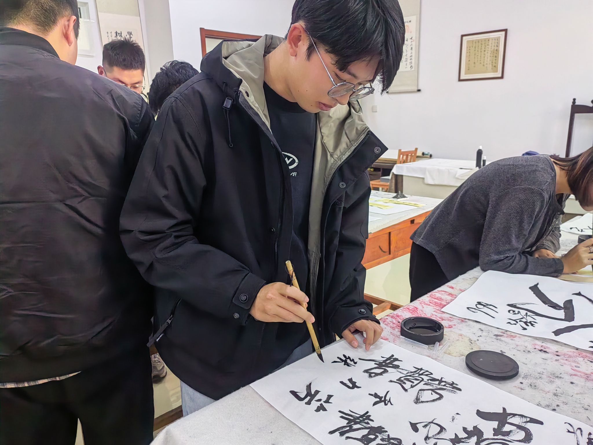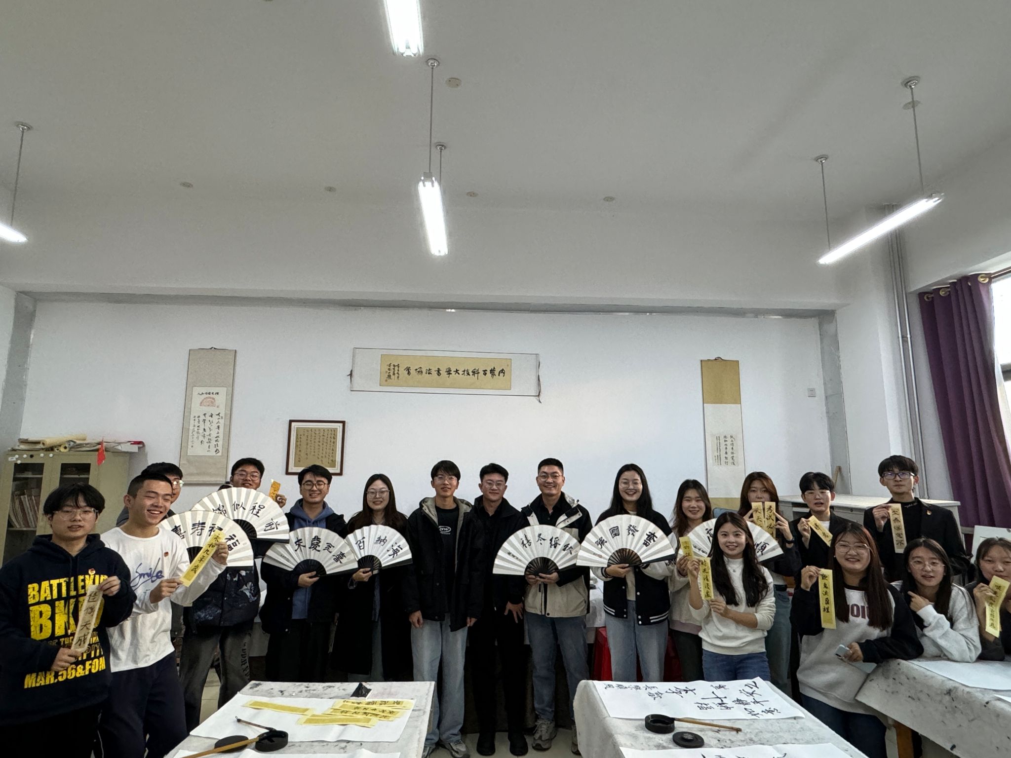 活动现场气氛热烈,党员同志们积极参与,共同感受书法艺术的独特魅力。活动伊始,党支部为每位党员同志发放了折扇和书签作为书写载体,笔、墨、纸、砚一应俱全。同志们挥毫泼墨,有的书写经典诗词,有的则创作励志话语,一笔一划尽显对书法艺术的热爱与敬意,充分展现了党员同志们的艺术修养与个性风采。活动接近尾声时,全体党员同志手持自己的书法作品合影留念,记录下这一珍贵时刻。