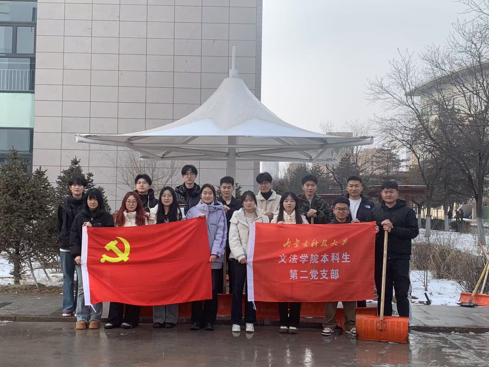 为确保校园道路畅通,保障师生安全,yl23455永利集团本科生第二党支部于3月4日下午,在明德楼前组织了一场以“党旗引领,温暖同行”为主题的除雪活动。