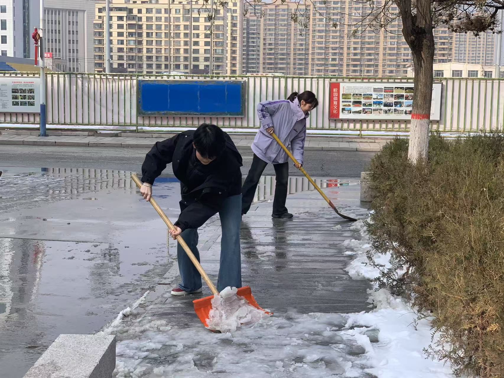 在党支部的组织下,党员和积极分子们分工明确,齐心协力,干劲十足,将一条条积雪覆盖的道路变成了师生安全通行的坦途。