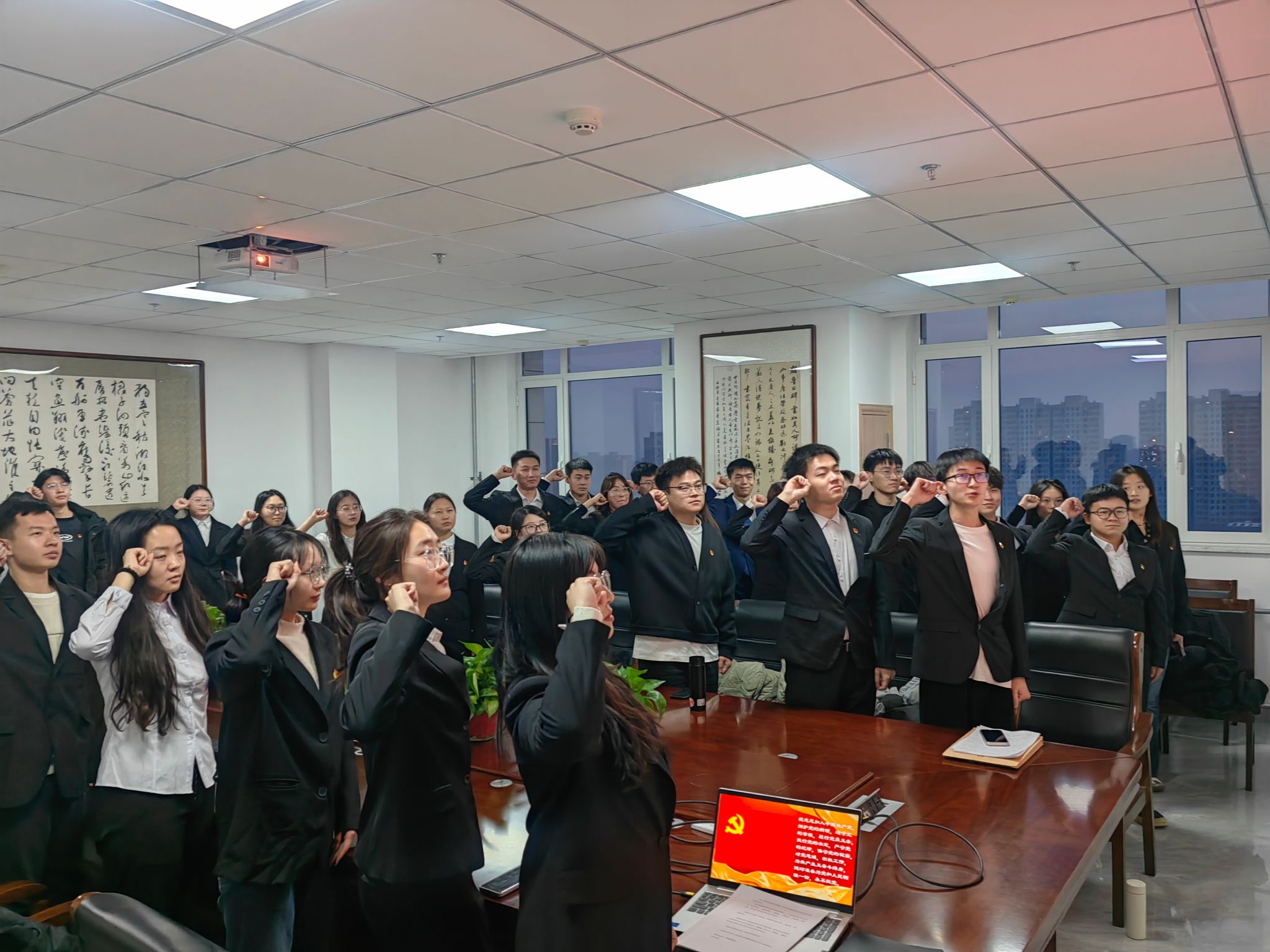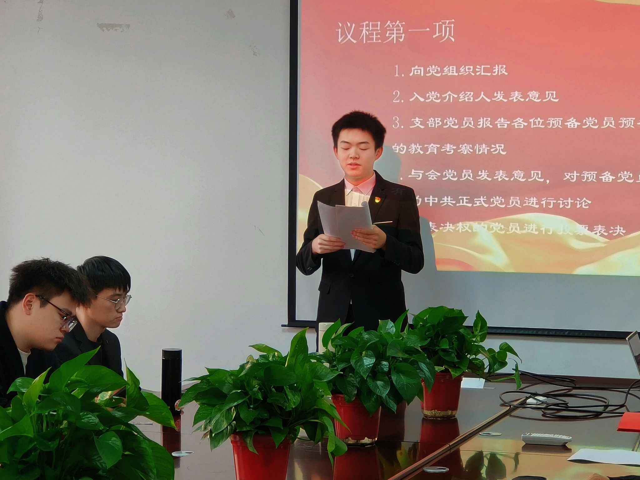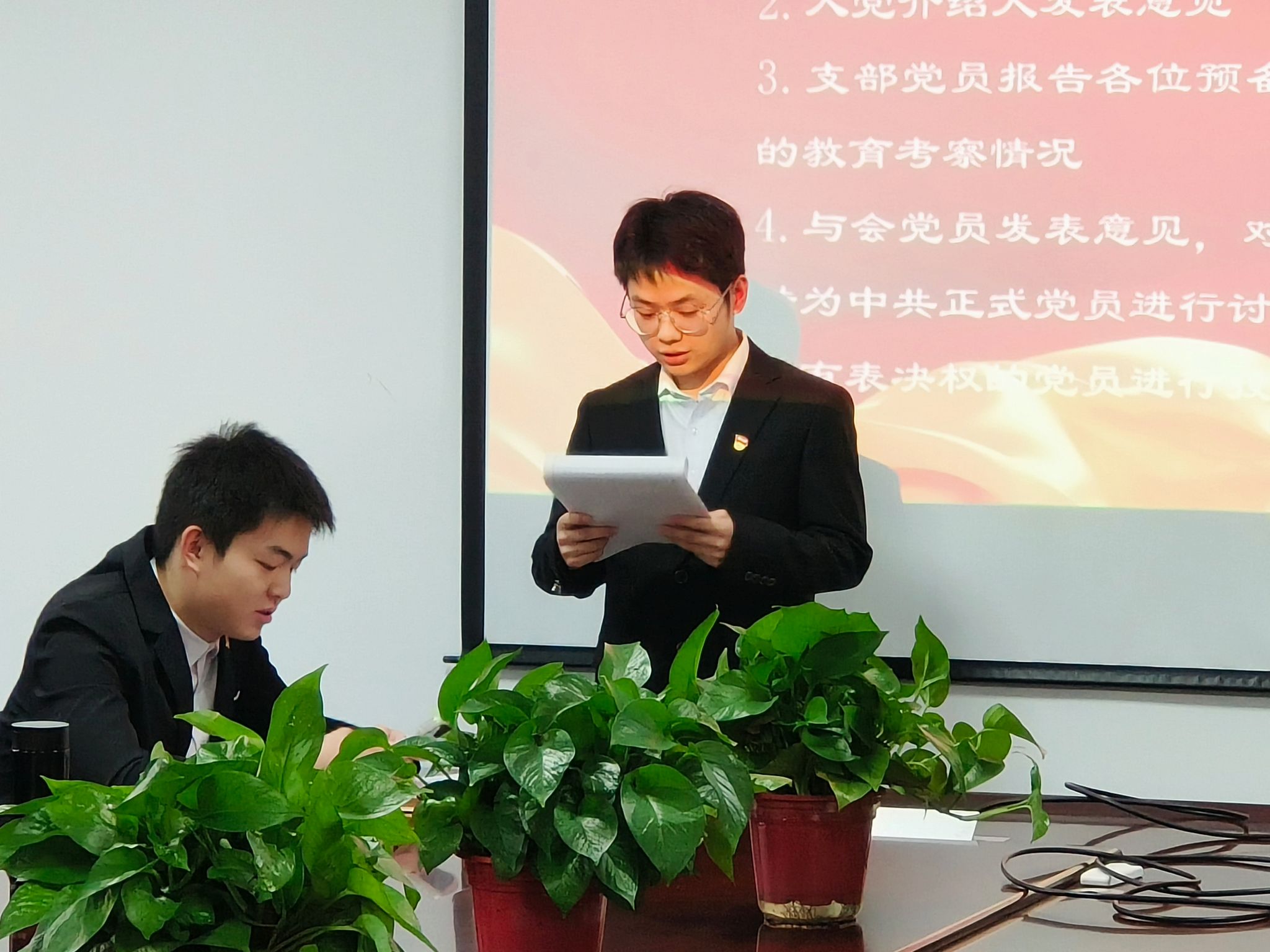2025年12月15日下午16:30,yl23455永利集团本科生第二党支部于文华楼B1503召开党员大会,讨论预备党员转正事宜并举行新发展预备党员入党宣誓仪式。
