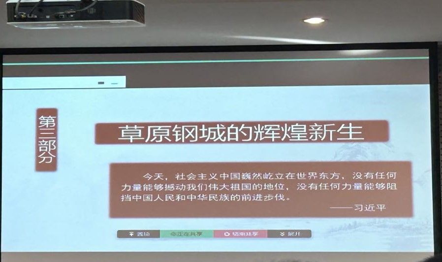 随后,崔汉苓老师从三个方面讲述了包头从一个塞北小镇发展至如今红色草原钢城的光辉历史:一是1840年鸦片战争时期列强侵华之后包头这座塞北小镇所经历的苦难史,二是党带领工农阶级推翻“三座大山”的不屈抗争史,三是建国之后党带领人民把包头建设成为红色草原钢城的辉煌发展史。