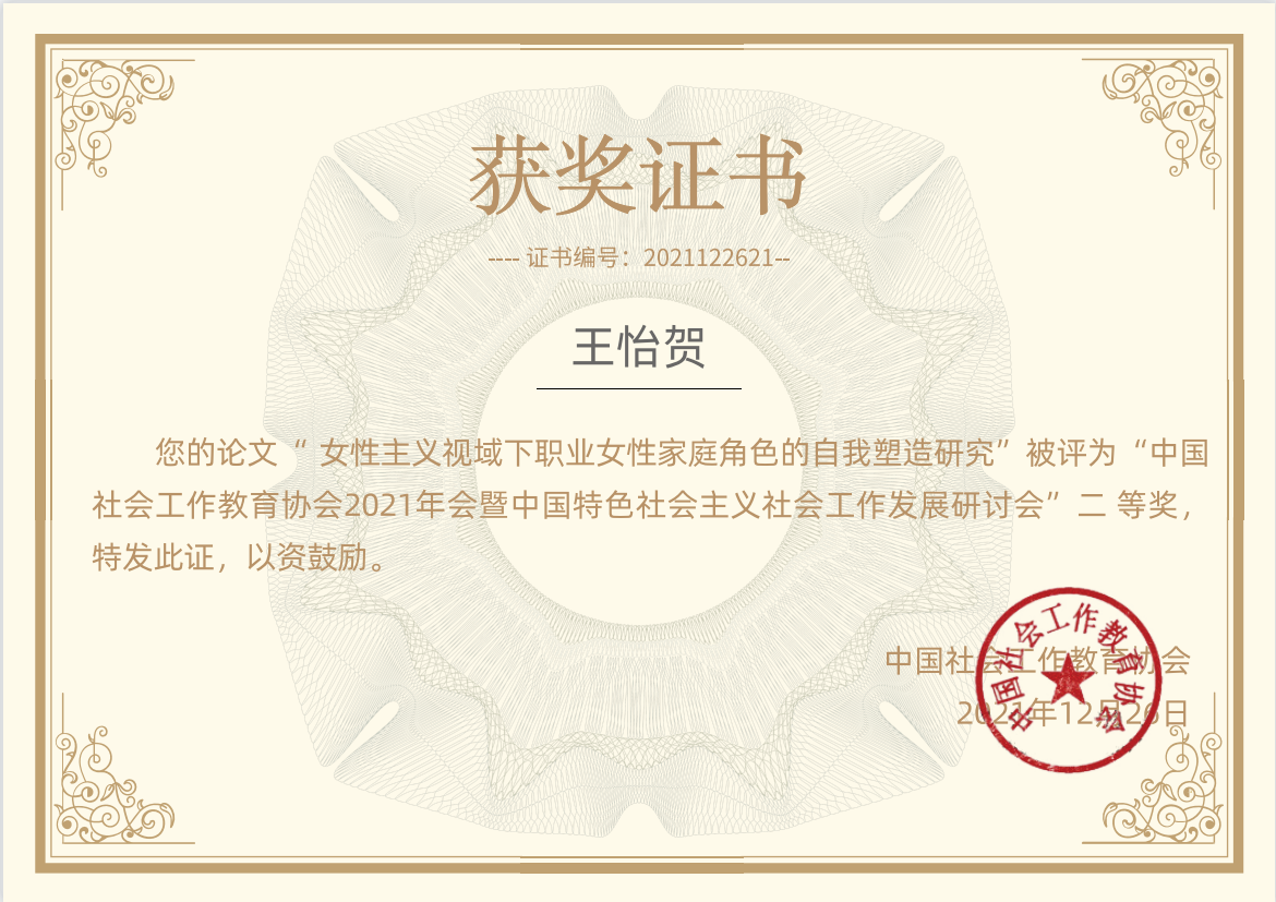 在2021年12月26日的年会闭幕式上,中国社会工作教育协会学术委员会主席王思斌教授宣布了本次年会优秀论文获奖名单,我院2021级社会工作硕士研究生王怡贺同学获得中国社会工作教育协会2021年会暨“中国特色社会主义社会工作发展探讨会”优秀论文二等奖。