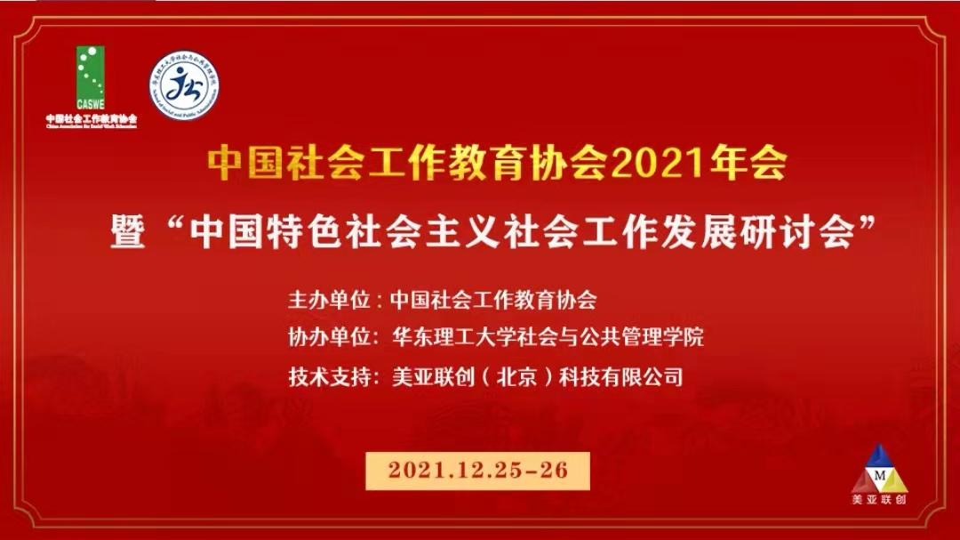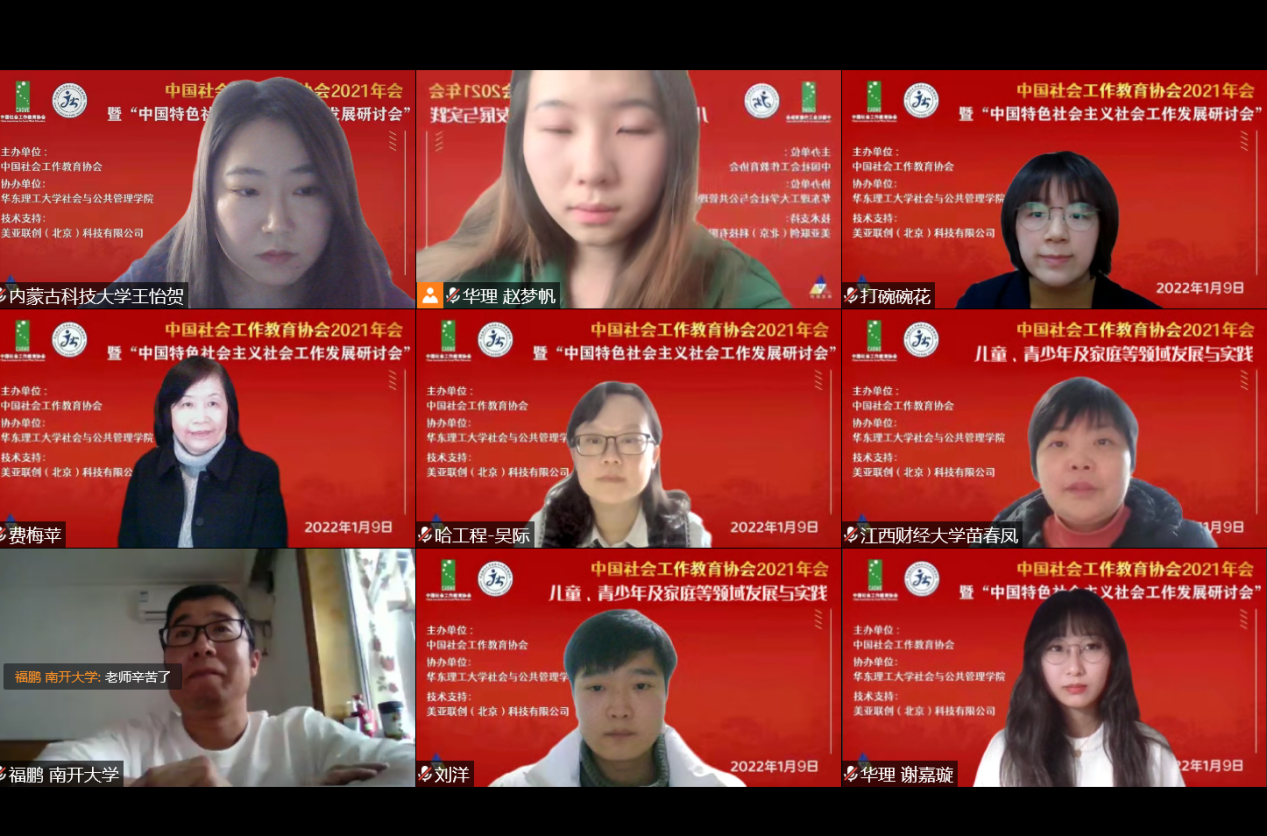 2021年12月25至26日,中国社会工作教育协会2021年会暨“中国特色社会主义社会工作发展研讨会”在线上举行。中国社会工作教育协会名誉会长王思斌教授、常务副会长关信平教授、副会长兼秘书长马凤芝教授、副会长刘梦教授等协会领导出席会议并作了主题发言。我院社会学系童斌博士,社会工作硕士研究生王怡贺、陈李红、代雪、张自明、苏瑞辉、刘泽宇同学参会。