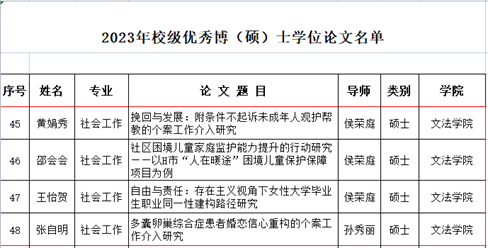 根据《永利y23455优秀博(硕)士学位论文评选及奖励办法》(内科大发〔2021〕41号)等文件要求,经本人申请、导师推荐、学院初选,并由校第30届博硕士学位评定委员会第二次会议评审通过,社会工作硕士教育中心2023届毕业生共有4篇学位论文获评2023年校级优秀硕士学位论文。分别是由侯荣庭副教授指导,黄娟秀同学撰写的《挽回与发展:附条件不起诉未成年人观护帮教的个案工作介入研究》、邵会会同学撰写的《社区困境儿童家庭监护能力提升的行动研究——以H市“人在暖途”困境儿童保护保障项目为例》、王怡贺同学撰写的《自由与责任:存在主义视角下女性大学毕业生职业同一性建构路径研究》和由孙秀丽副教授指导,张自明同学撰写的《多囊卵巢综合症患者婚恋信心重构的个案工作介入研究》。