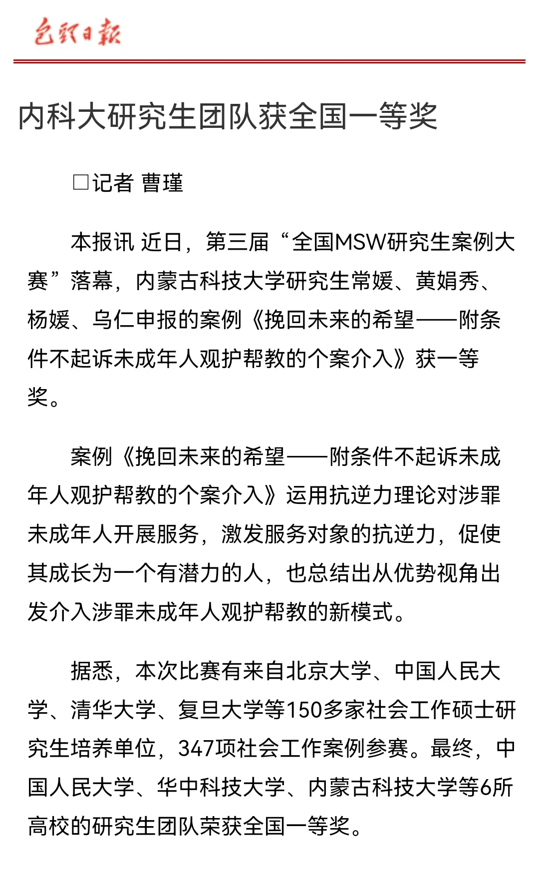 由永利y23455yl23455永利集团侯荣庭副教授指导,研究生常媛、黄娟秀、杨媛、乌仁申报的案例《挽回未来的希望——附条件不起诉未成年人观护帮教的个案介入》获第三届“全国MSW研究生案例大赛”全国一等奖,并被包头日报转载报道。