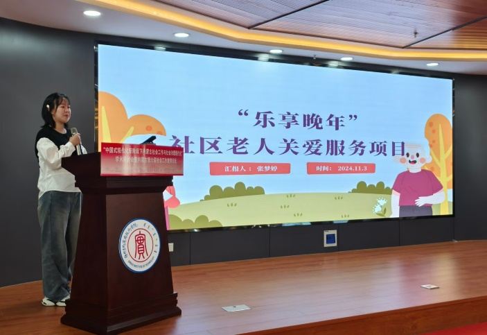 通过前期调研与项目申报,由侯荣庭副教授指导,2023级硕士研究生杨媛、张梦婷、郭旭东、万雨晴、李弘哲五位同学申报的“乐享晚年”社区老人关爱服务项目入围全区决赛环节。在决赛路演现场,张梦婷同学从社会需求、项目目标、项目计划、可持续性以及项目预算五个方面进行详细汇报,并取得优秀奖。