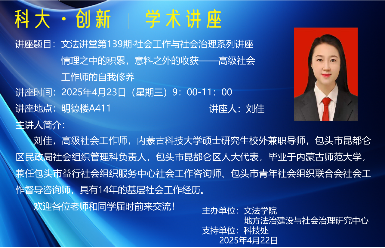 2025年4月23日上午,学院第139期文法讲堂于A411报告厅顺利举行。本次讲座以“情理之中的积累,意料之外的收获——高级社会工作师的自我修养”为题,特邀永利y23455硕士研究生校外兼职导师,包头市昆都仑区民政局社会组织管理科负责人,包头市昆都仑区人大代表,高级社会工作师刘佳担任主讲嘉宾。社会工作硕士(MSW)教育中心副主任侯荣庭副教授主持讲座,我院社会工作专业师生积极参加。
