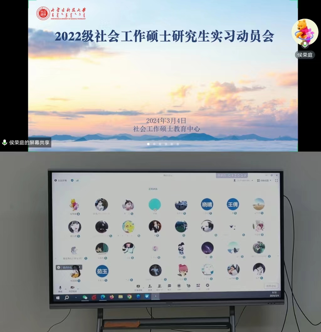 为引导学生做好专业实习前的各项准备工作,保障研究生实习工作有序开展,社会工作硕士教育中心于2024年3月4日上午9点在明德楼A302教室召开2022级社会工作研究生实习动员会。动员会由社会工作硕士教育中心副主任侯荣庭副教授主持,2022级社会工作全体硕士生通过线上和线下相结合的方式参与本次动员会。