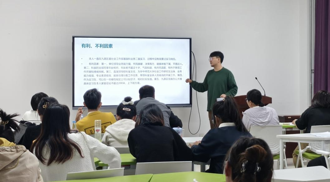 汇报会上,同学们按照顺序依次进行实习汇报,分别从实习单位简介、实习内容、实习收获、感悟和反思等方面进行交流和分享,以生动的案例和真挚的情感分享实习过程中的所思所想,勇于汇报工作过程中的困难和挑战,并讲述了如何从这些案例中汲取经验和感悟。