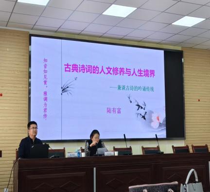 讲座中,陆教授首先阐述了古典诗词在唤醒读者心灵感发、提升文明素质和丰富精神世界方面的重要作用;其次,结合当代网络诗词阐释了诗词创作的特点,并结合具体诗作指出品读古典诗词的方法路径;最后通过现场吟诵,示范了古典诗词的吟诵规则。